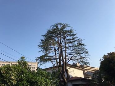 7mを超える高木剪定を行いました。クレーンを使用しながらの大掛かりな剪定作業となりましたが、施工後は枝葉が減りスッキリとした見た目になりました。ずっと受け継がれている土地で大切にしている樹ということで、これからもお手入れをしにお伺いさせていただきます。