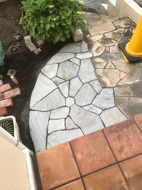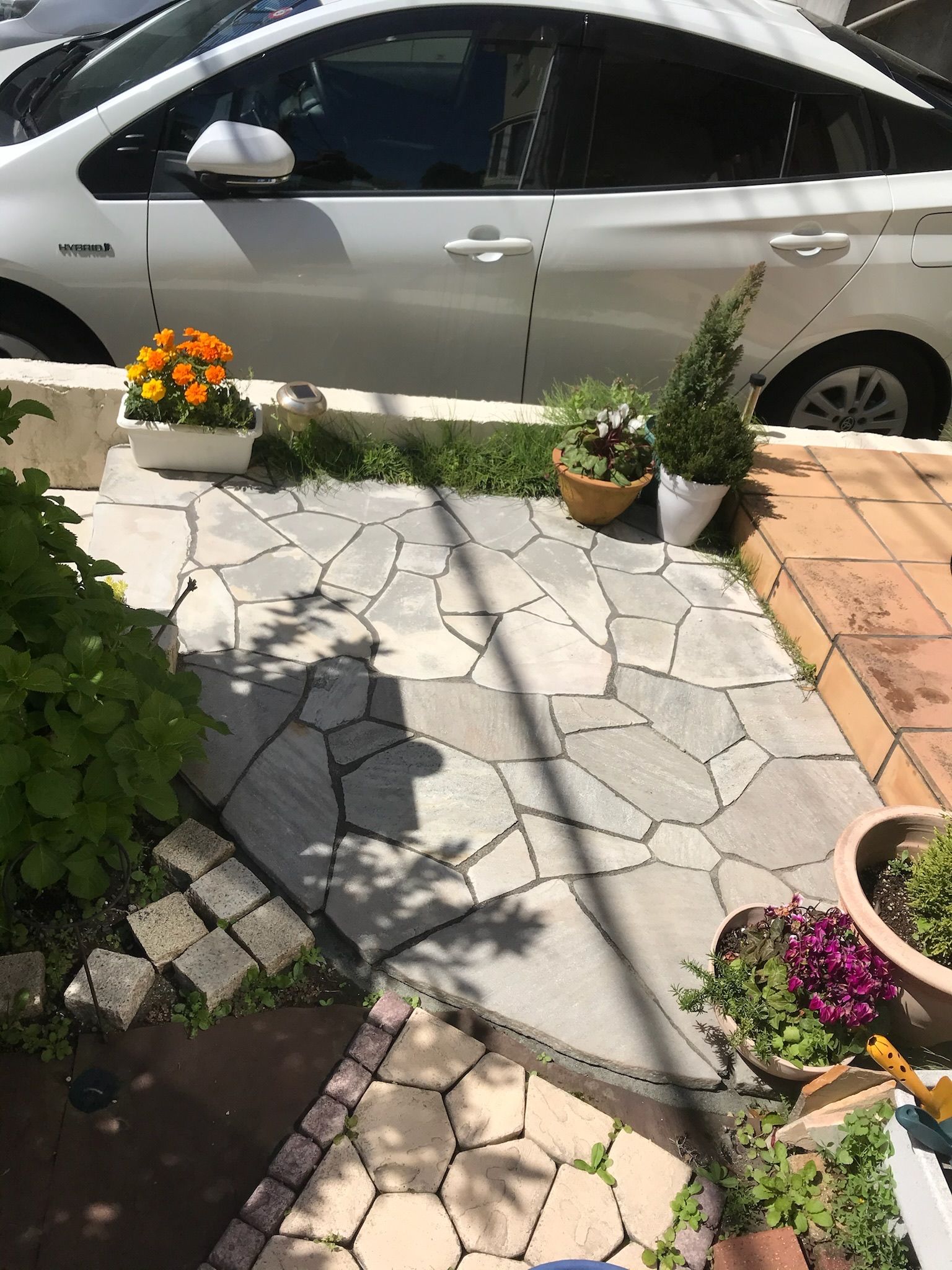 乱形石貼りのアプローチを作成しました。西洋風の高級感のある石貼りが玄関まで導きます。植物との相性抜群でさらに素敵なお庭になりました。